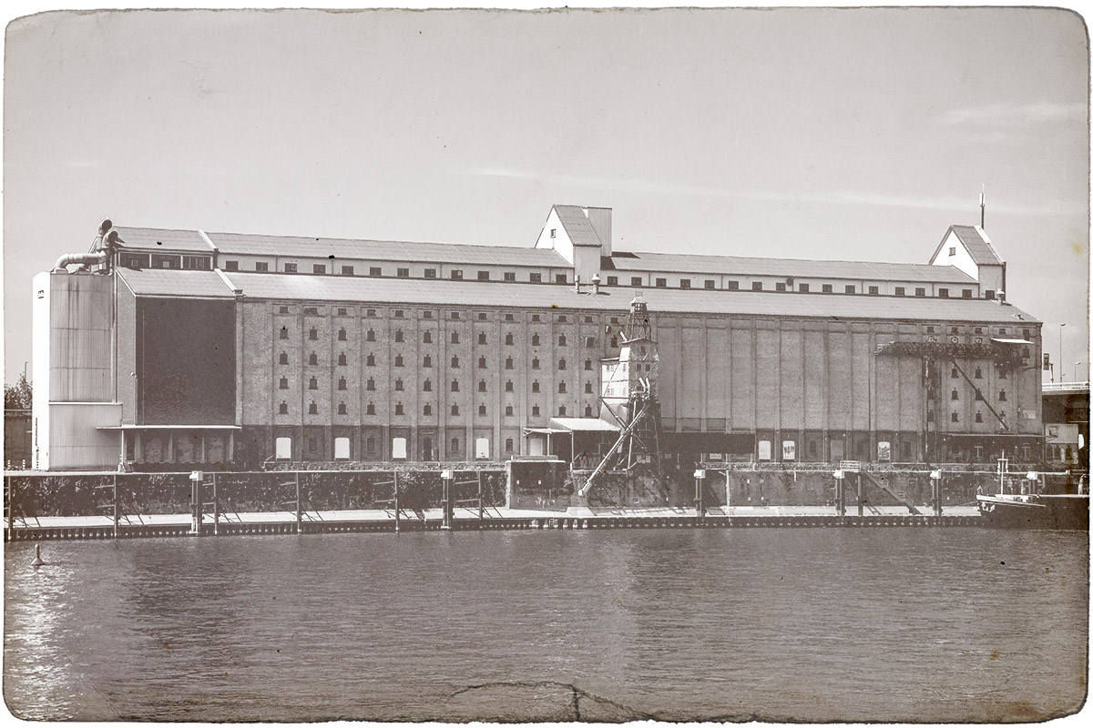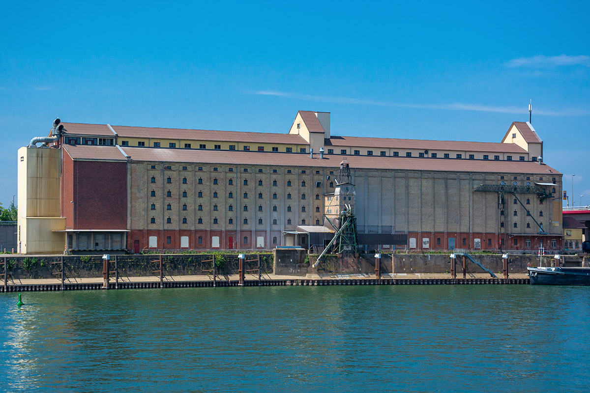 Ein altes unter Denkmalschutz stehendes Getreidesilo in der rheinland-pfälzischen Stadt Ludwigshafen. Es dient der Annahme und Lagerung von Getreide, insbesondere von Mais und Weizen, und spielt eine wichtige Rolle in der regionalen Landwirtschaft. Die Aufnahme wurde am 21. Mai 2020 gemacht. Es könnte sich aber auch um ein Foto aus dem Jahr 1955 handeln.