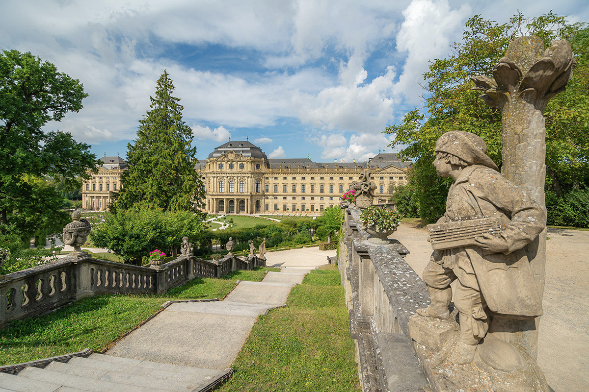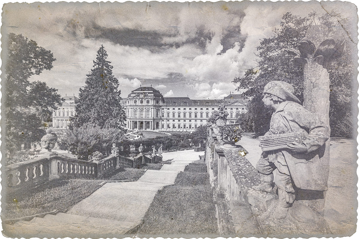Der barocke Residenzbau, die Würzburger Residenz, wurde um das Jahr 1744 fertiggestellt. Die Residenz verbindet französische, österreichische und italienische Architekturströmungen und gilt als Meisterwerk des europäischen Barock. Sie diente als Vorbild für viele spätere Schlossbauten in Europa. Dieses Foto könnte ungefähr 100 Jahre später entstanden sein.