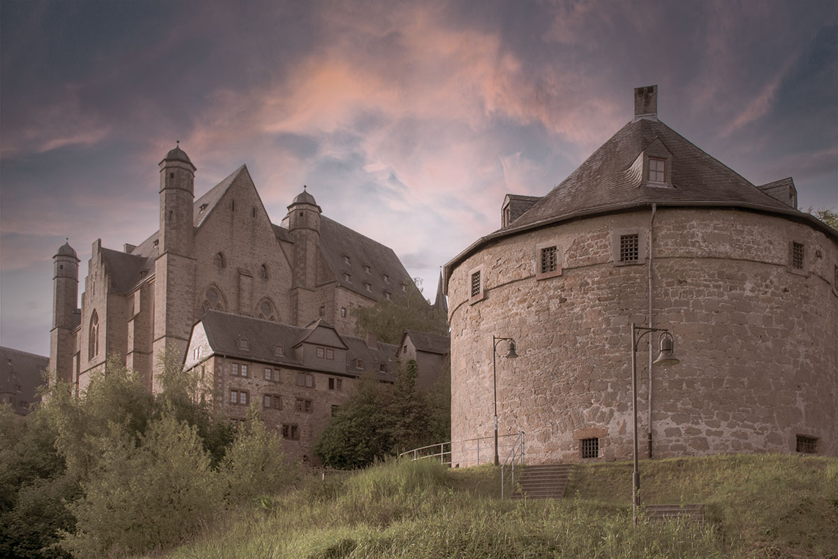 Das Landgrafenschloss Marburg, das sich auf dem Schlossberg in einer Höhe von 287 m befindet, wurde im 11. Jahrhundert als Burg angelegt. Das Foto zeigt das Schloss aus Richtung Nordwesten und könnte im Jahr 1970 entstanden sein.