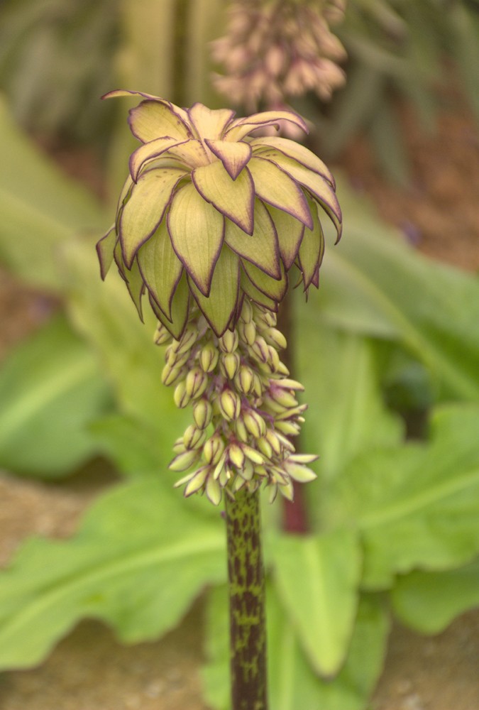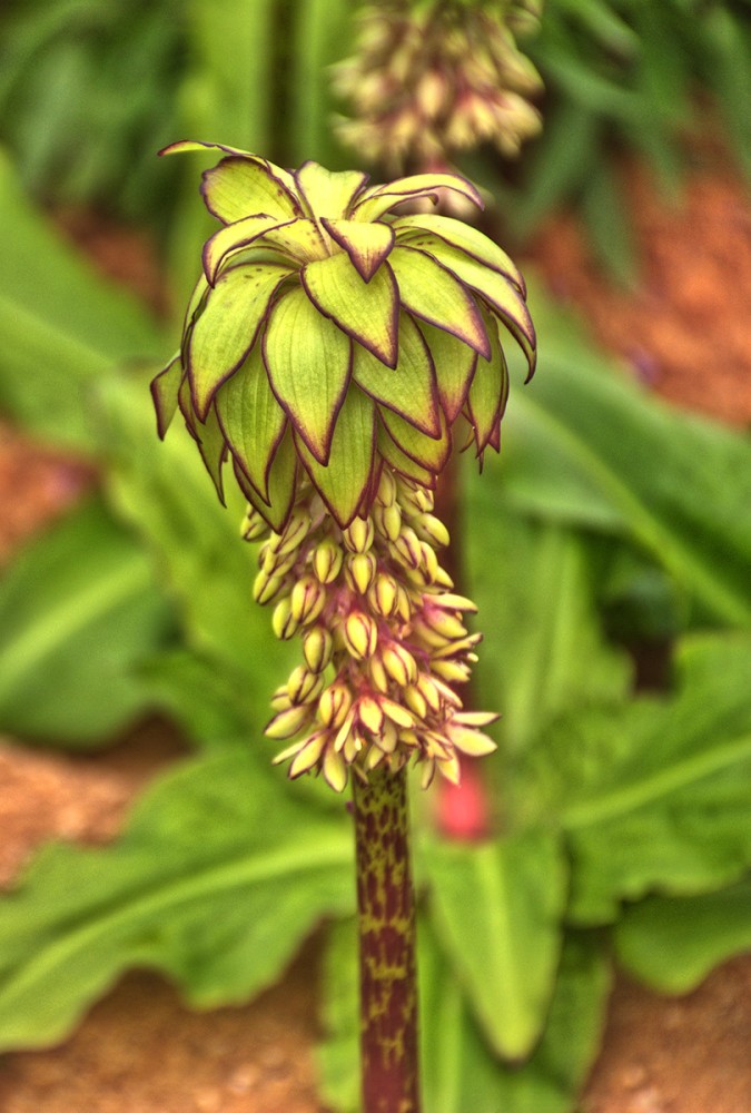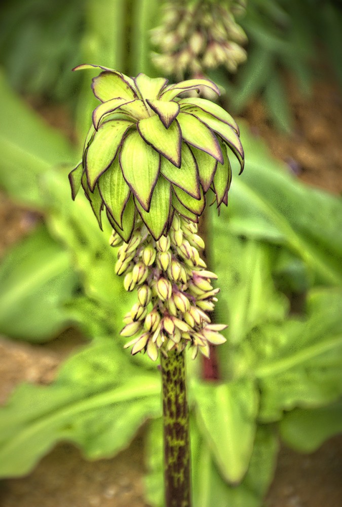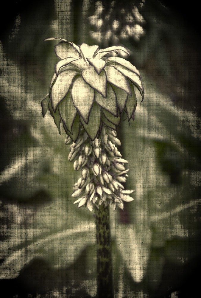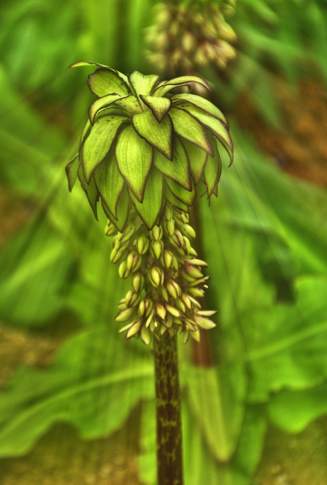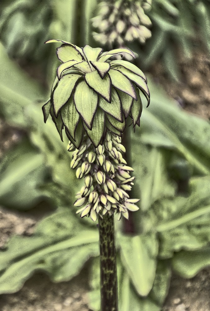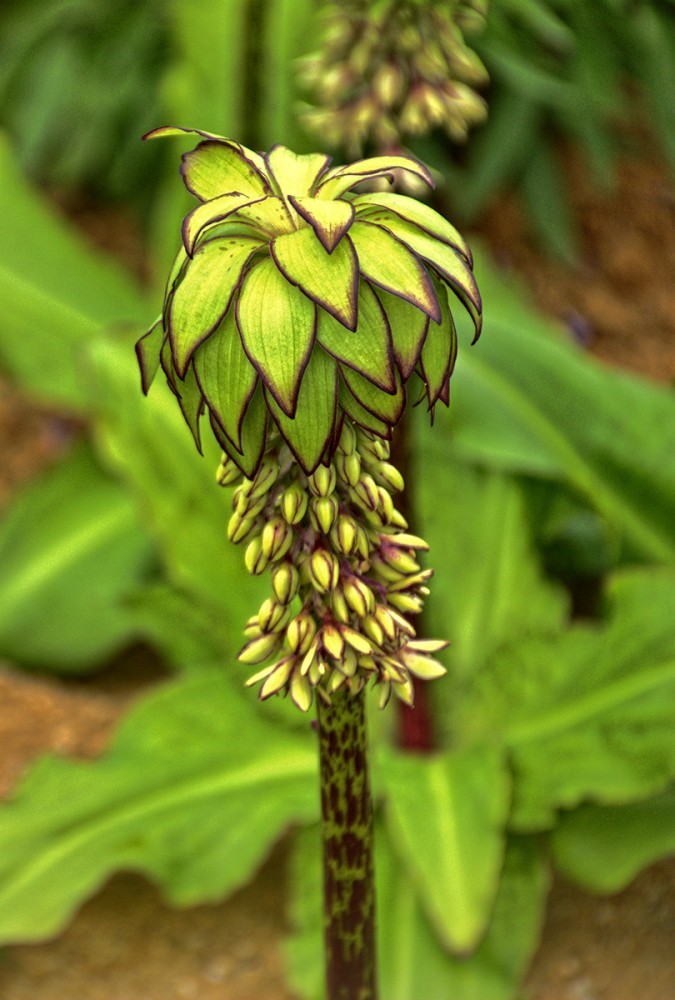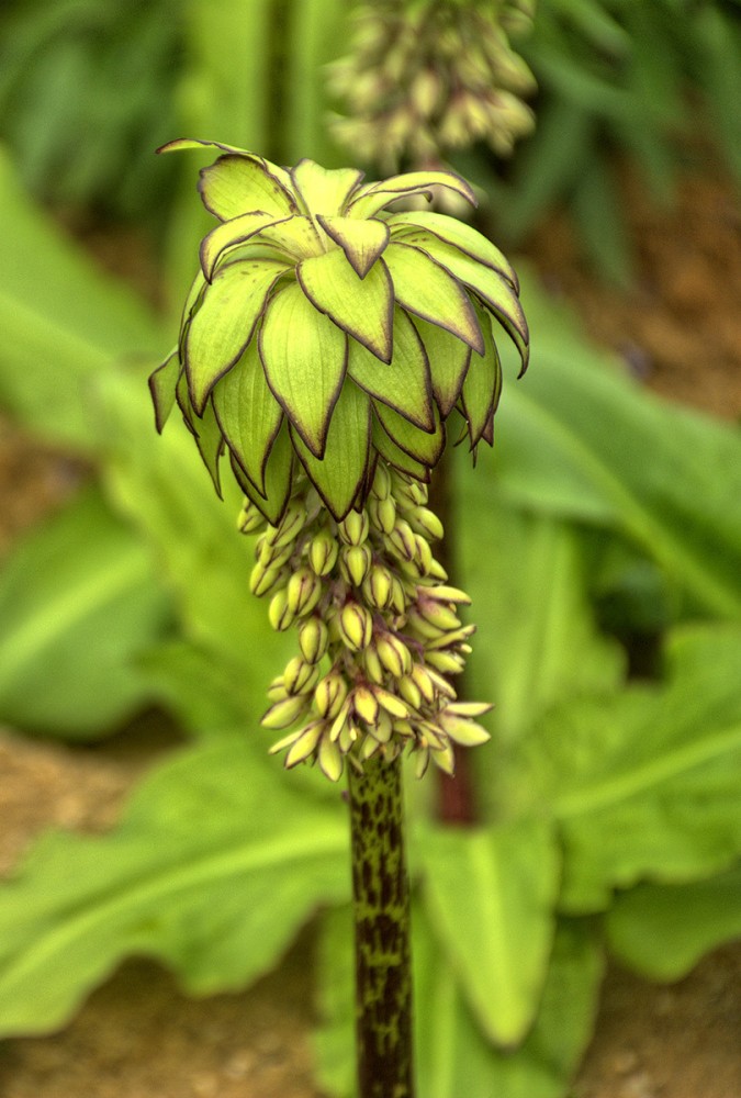Bei der Ananasblume handelt es sich um einen Verwandten des Spargels. Sie erreicht eine Höhe von 30 bis 60 cm und hat ihre Blütezeit von Juli bis in den September hinein. Mit richtigen Namen heißt sie "Schopflilie", da ihre traubenartigen hellgrünen Blüten das Aussehen einer Lilie haben.