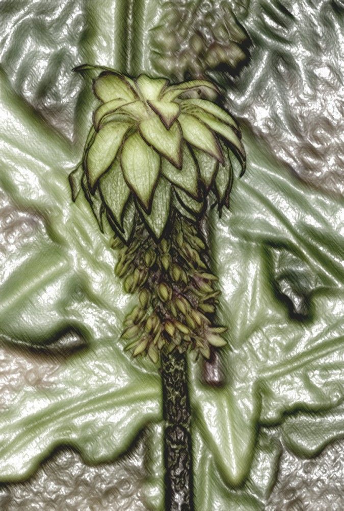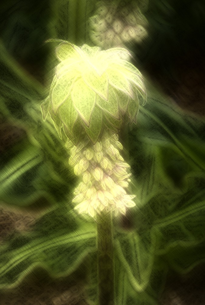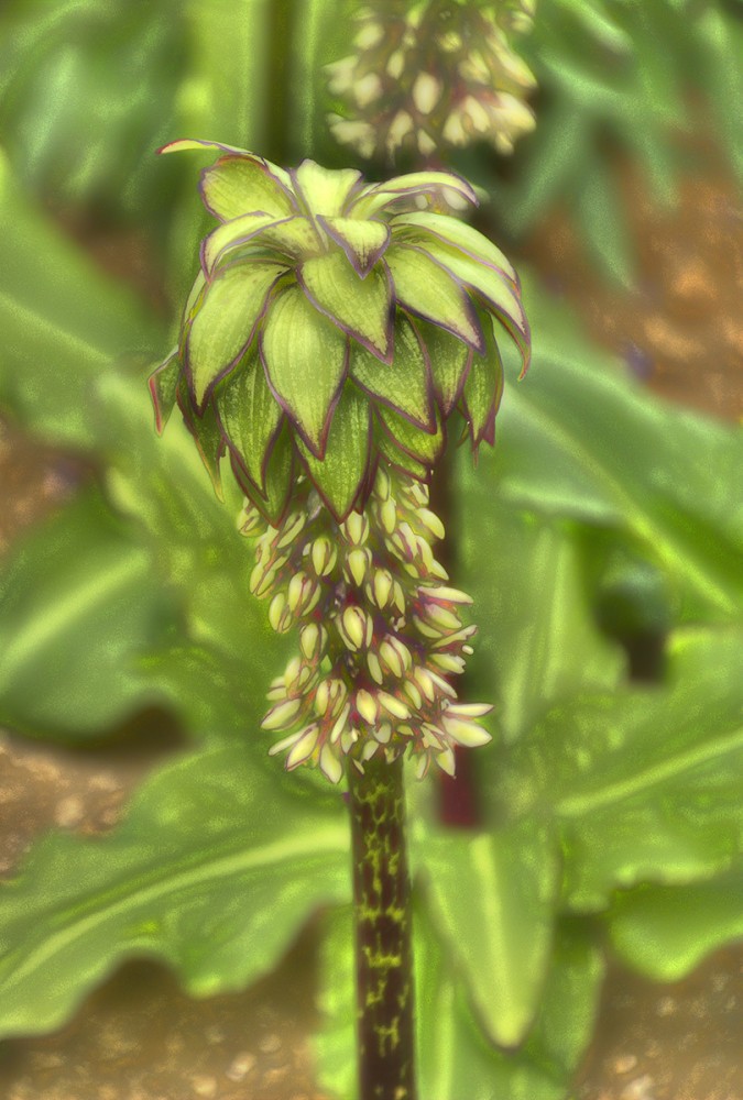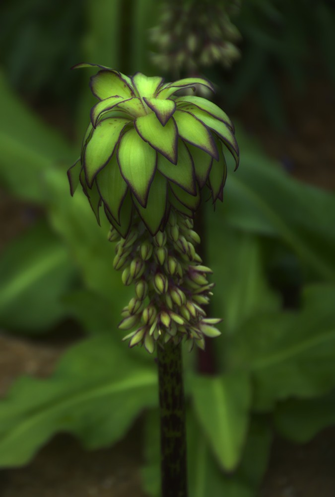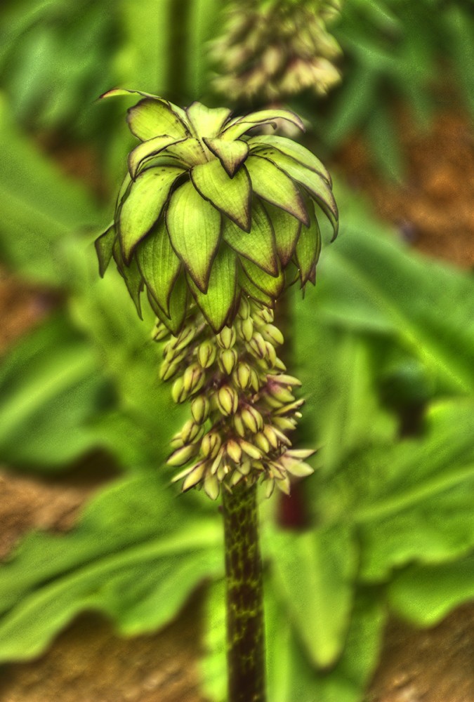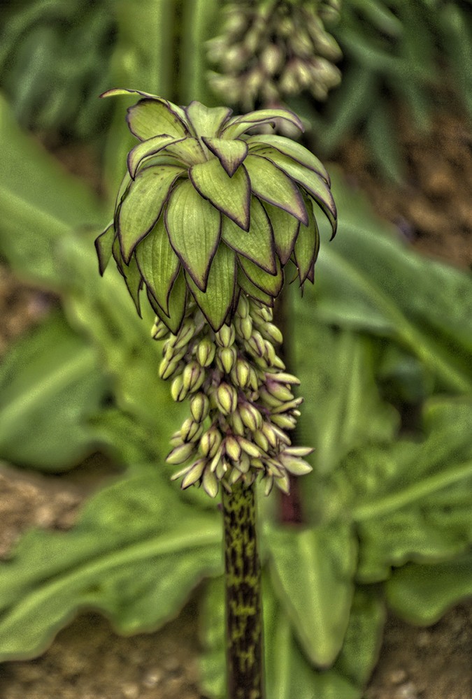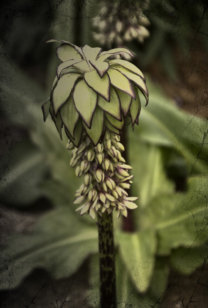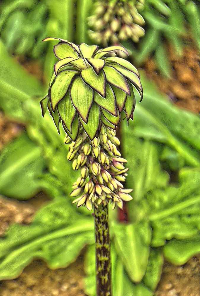 Bei der Ananasblume handelt es sich um einen Verwandten des Spargels. Sie erreicht eine Höhe von 30 bis 60 cm und hat ihre Blütezeit von Juli bis in den September hinein. Mit richtigen Namen heißt sie "Schopflilie", da ihre traubenartigen hellgrünen Blüten das Aussehen einer Lilie haben.