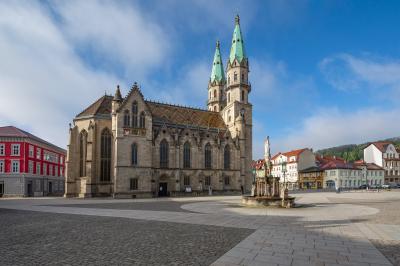 Das Bild zeigt die dreischiffige Hallenkirche "Unserer lieben Frauen" in Meiningen, die sich auf dem Marktplatz der Stadt befindet. Vor der Kirche ist der Heinrichsbrunnen mit der Skulptur von Kaiser Heinrich II. des Heiligen Römischen Reichs zu sehen.
