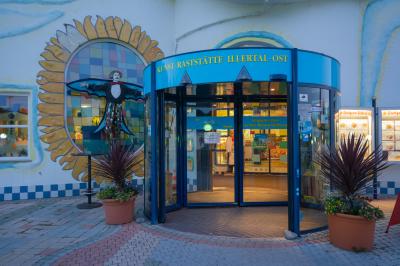 Die Kunst-Raststätte Illertal Ost liegt an der Bundesautobahn 7 zwischen den Anschlussstellen Dettingen an der Iller und Altenstadt an der Iller in Oberschwaben in Fahrtrichtung Ulm. Das Foto zeigt den Haupteingang in das Restaurant.