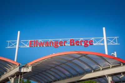 Schriftzug "Ellwanger Berge" über der Esso Tankstelle auf dem Rasthof "Ellwanger Berge West" in Baden-Württemberg.