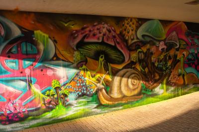 Dieses Graffito zeigt eine Schnecke, die sich in dem aufgesprühten "Wunderland" sehr wohl zu fühlen scheint.