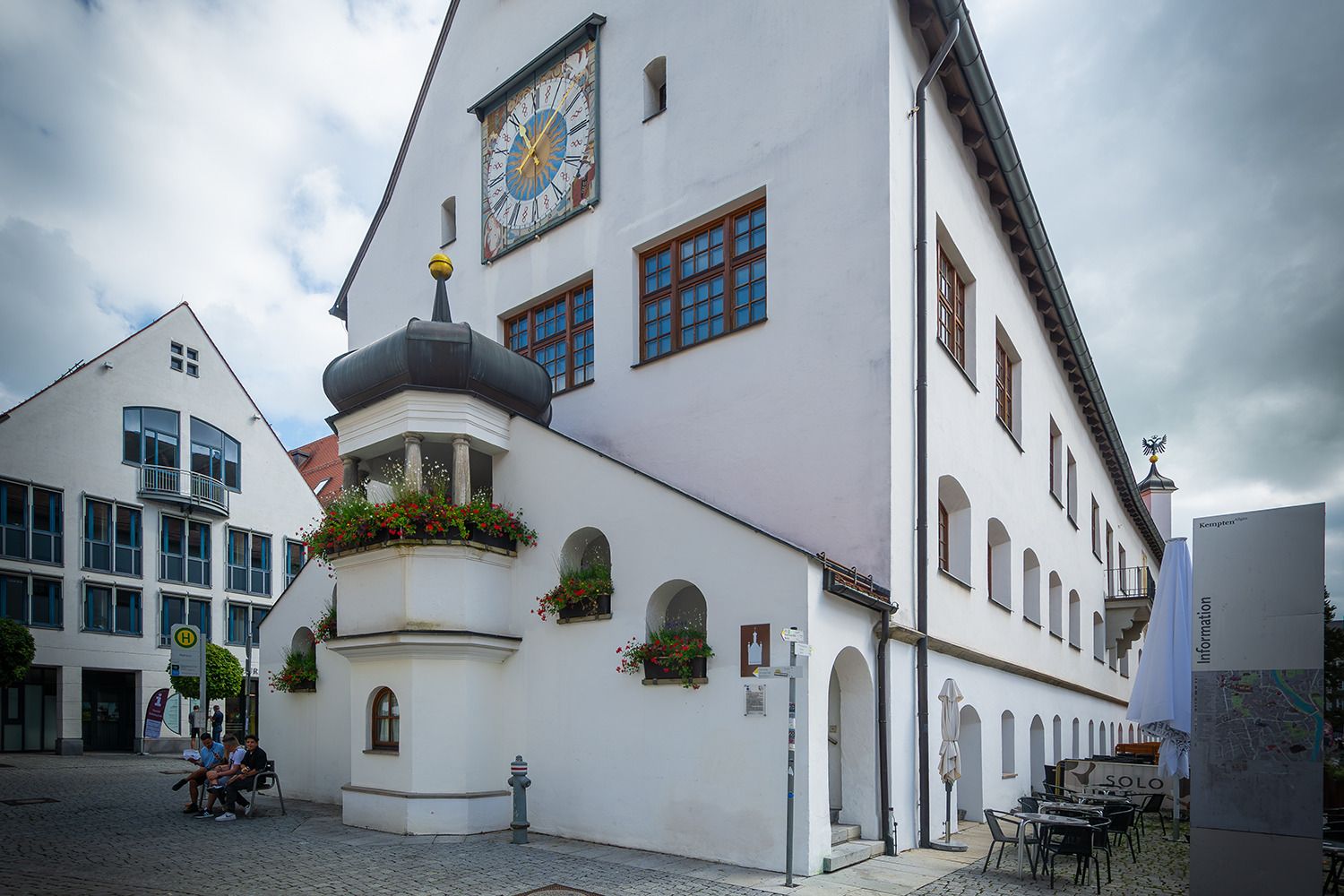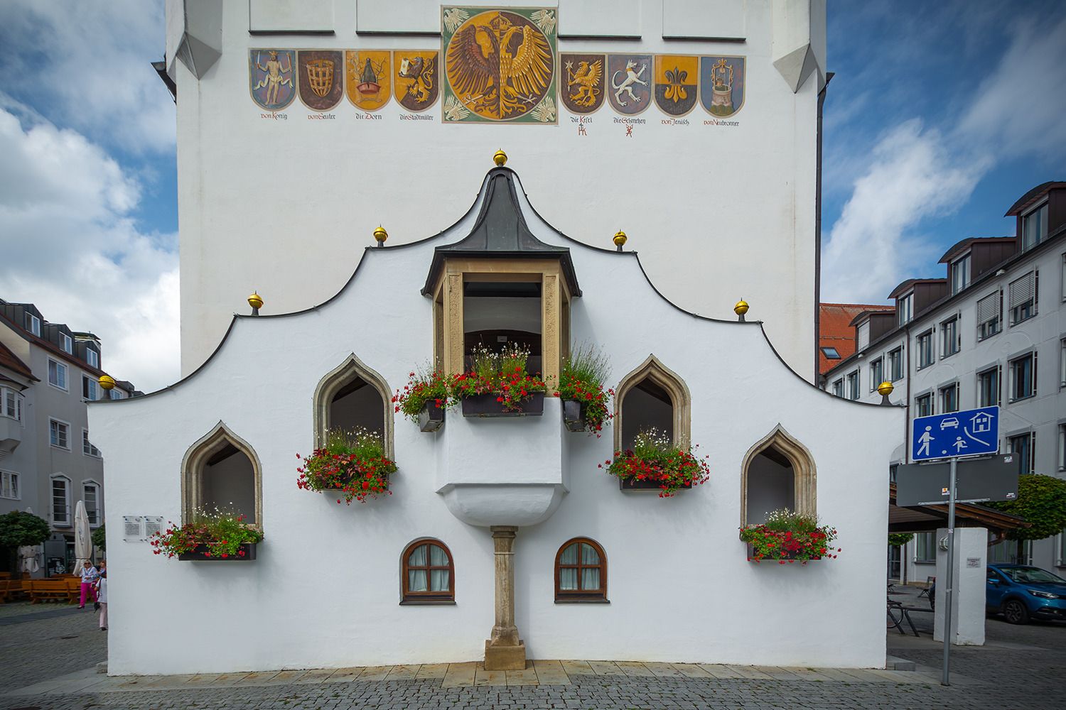 Im Jahr 1474 wurde das mittelalterliche, heute unter Denkmalschutz stehende Rathaus der Stadt Kempten im Allgäu durch ein Fachwerkhaus, das im Jahr 1368 errichtet wurde, als Steinbau erneuert. Das Foto zeigt die Ostfassade das Rathauses mit den Wappen der Patrizierfamilien sowie den Treppenvorbau. Die Wappen von links nach rechts: von König, von Seuter, die Dorn, die Stadtmüler, Großes Wappen Doppeladler, die Kesel, die Schmelzer, von Jenisch und von Neubronner. Sehr gut sind auch die Doppeladler auf den beiden Seitentürmen zu erkennen. Auf dem Zwiebeldach steht ein Trompetenmännle, das im Jahr 1601 aufgesetzt wurde. Das Rathaus befindet sich auf dem langgestreckten Rathausplatz in der Altstadt von Kempten und bietet den Besuchern der umliegenden Cafés eine tolle Kulisse.