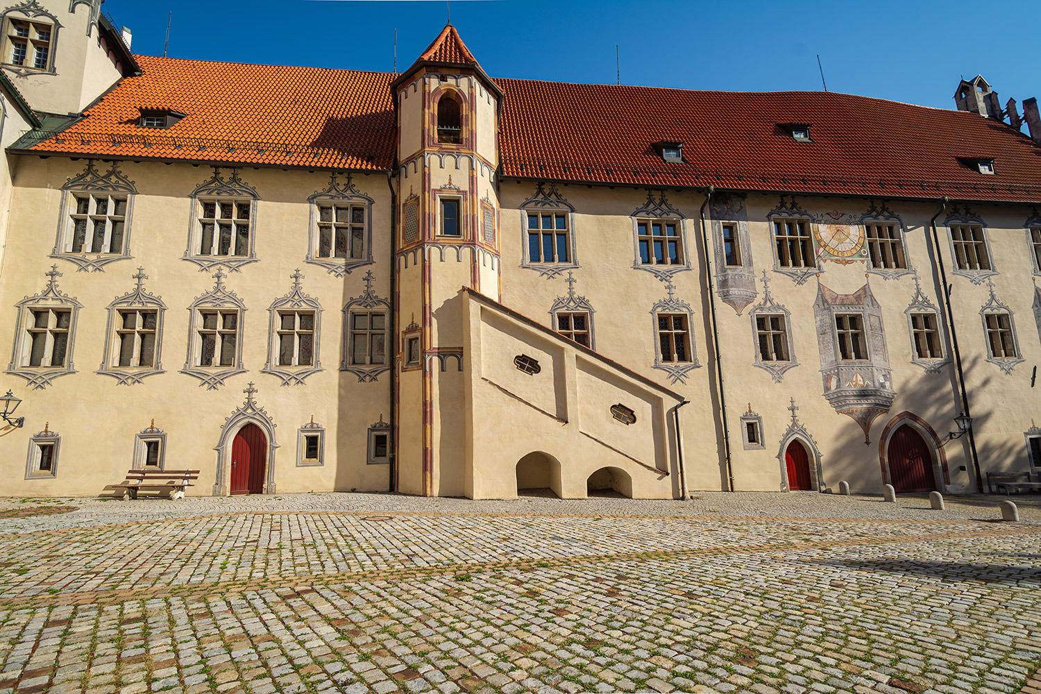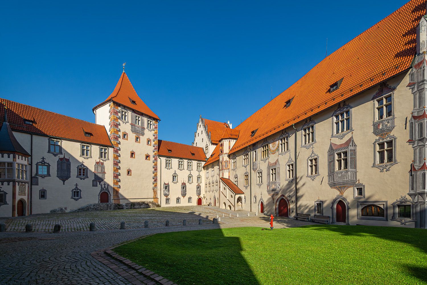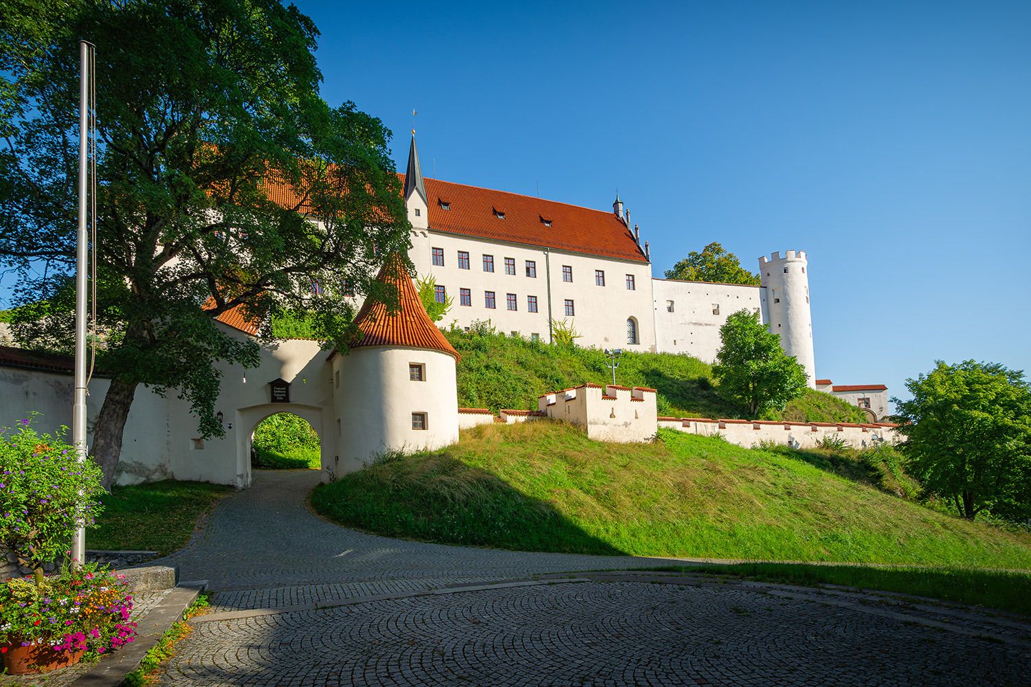 Die Vollendung des Burgschlosses fand erst im Jahr 1322 unter der Leitung des damaligen neuen Stadtherren Bischof Friedrich I. von Augsburg statt. Die heutige prachtvolle Gestalt erhielt das Bauwerk in den Jahren von 1486 bis 1505 unter Federführung von Fürstbischof Friedrich von Zollern (* 1451; † 1505). Besonders sehenswert sind die spätgotischen Illusionsmalereinen an den Fassaden im Schlosshof, der Rittersaal, die Staatsgalerie sowie die städtische Gemäldegalerie, ihren Schwerpunkt auf die schwäbische Malerei der Spätgotik legt.