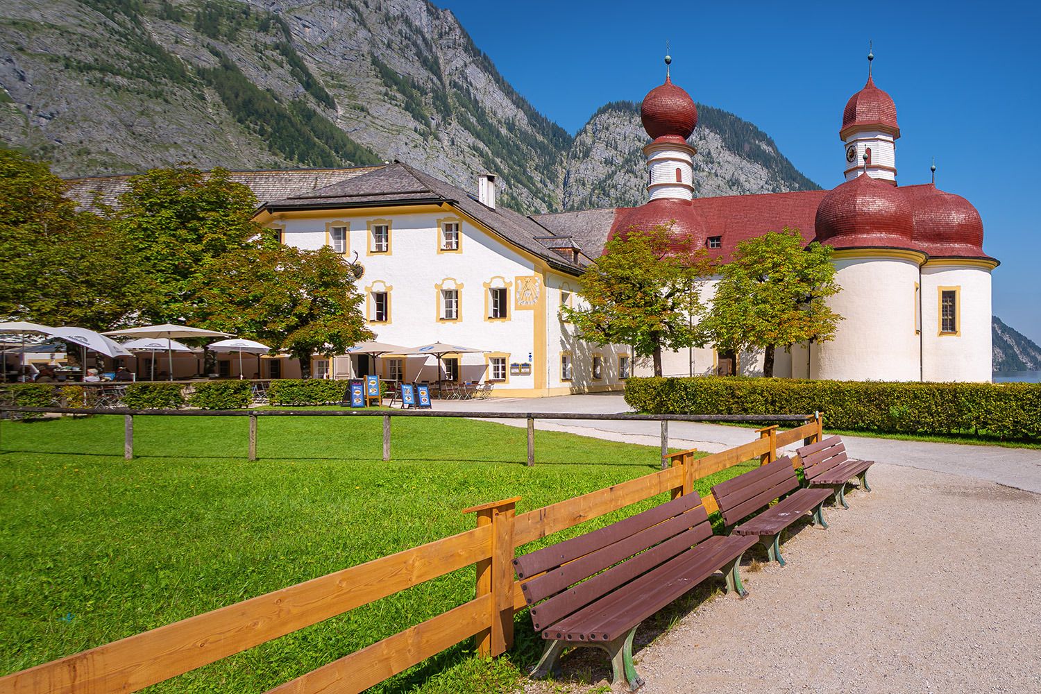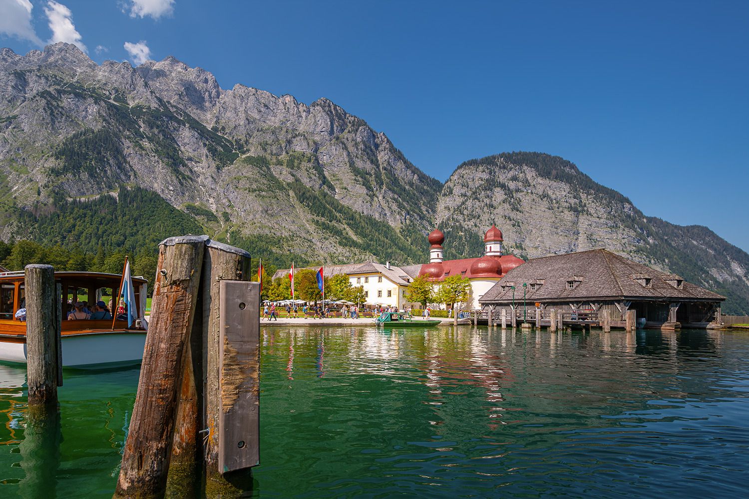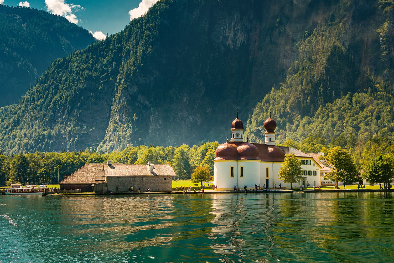 St. Bartholomä ist eine malerische Wallfahrtskirche am Westufer des Königssees, einem wunderschönen See in Bayern, in der Nähe der Stadt Schönau am Königssee. Dieses Gebiet ist Teil des Nationalparks Berchtesgaden, einer Region, die für ihre atemberaubende Naturschönheit bekannt ist, die von dramatischen Alpenlandschaften, kristallklarem Wasser und steilen Berggipfeln geprägt ist. Die Kirche selbst ist mit ihren markanten roten Zwiebeltürmen ein beliebtes Wahrzeichen in diesem Landstrich. Sie wurde ursprünglich im 12. Jahrhundert erbaut und später im 17. Jahrhundert im Barockstil renoviert. Die Kirche ist nach dem Heiligen Bartholomäus benannt, dem Schutzpatron der Almbauern und Senner.