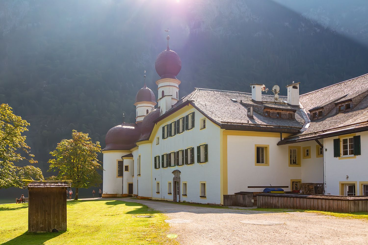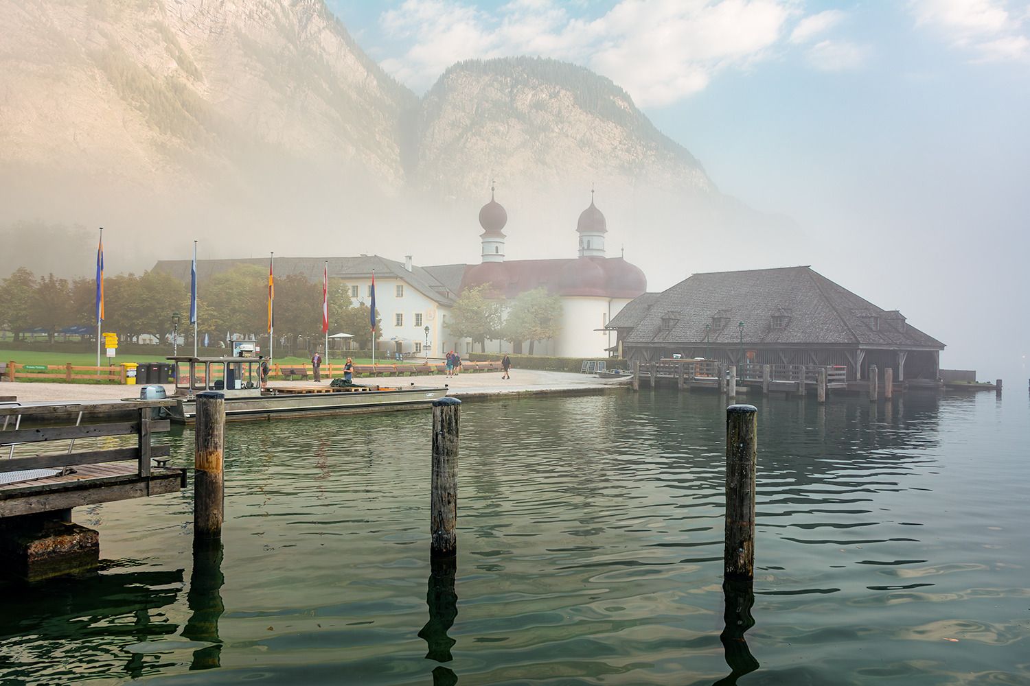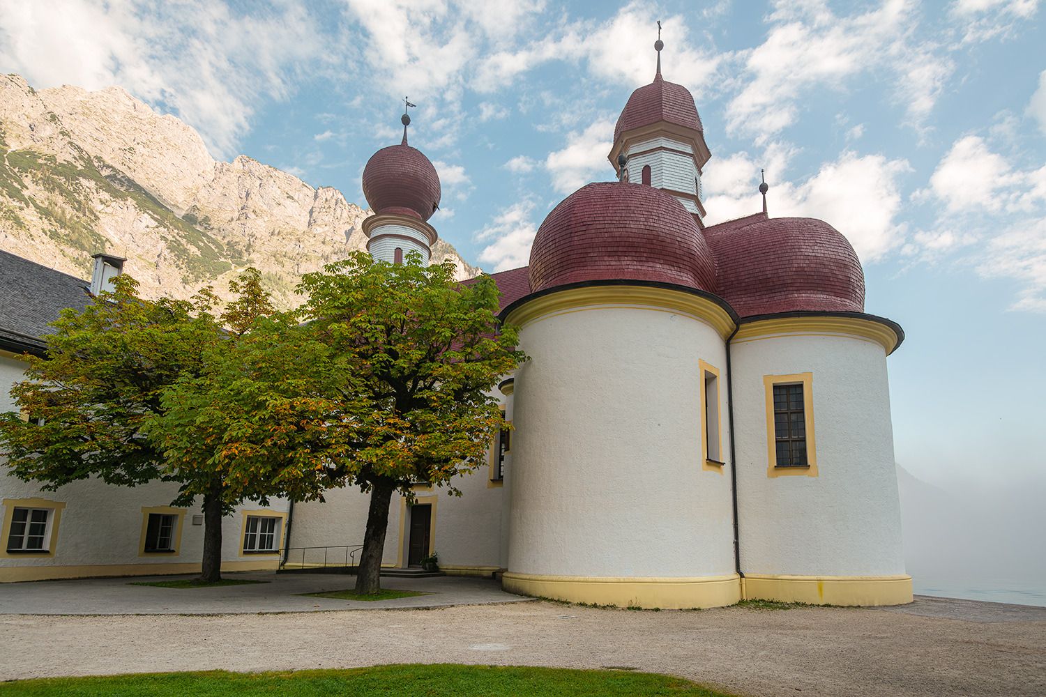 St. Bartholomä ist eine malerische Wallfahrtskirche am Westufer des Königssees, einem wunderschönen See in Bayern, in der Nähe der Stadt Schönau am Königssee. Dieses Gebiet ist Teil des Nationalparks Berchtesgaden, einer Region, die für ihre atemberaubende Naturschönheit bekannt ist, die von dramatischen Alpenlandschaften, kristallklarem Wasser und steilen Berggipfeln geprägt ist. Die Kirche selbst ist mit ihren markanten roten Zwiebeltürmen ein beliebtes Wahrzeichen in diesem Landstrich. Sie wurde ursprünglich im 12. Jahrhundert erbaut und später im 17. Jahrhundert im Barockstil renoviert. Die Kirche ist nach dem Heiligen Bartholomäus benannt, dem Schutzpatron der Almbauern und Senner.