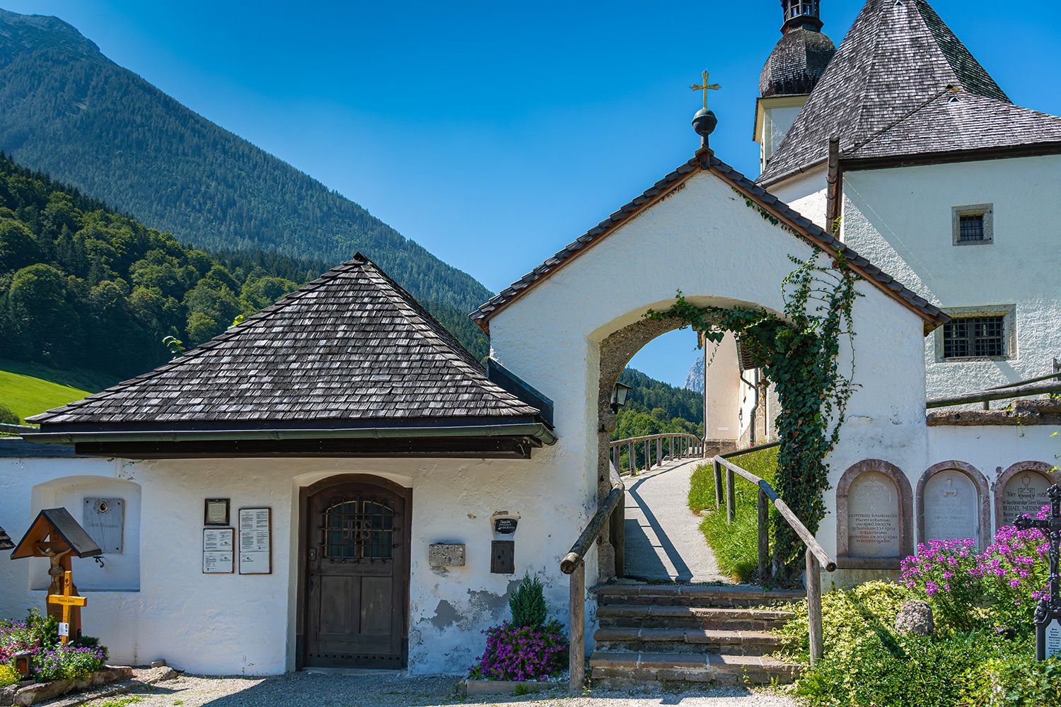 Die Kirche liegt an der Ramsauer Ache, einem klaren Gebirgsbach, und wird von den hoch aufragenden Gipfeln der Reiter Alpe und des Watzmanns eingerahmt. Der Standort bietet atemberaubende Ausblicke, insbesondere wenn die Umgebung schneebedeckt ist oder im Herbst, wenn die Blätter leuchtende Farben annehmen.
