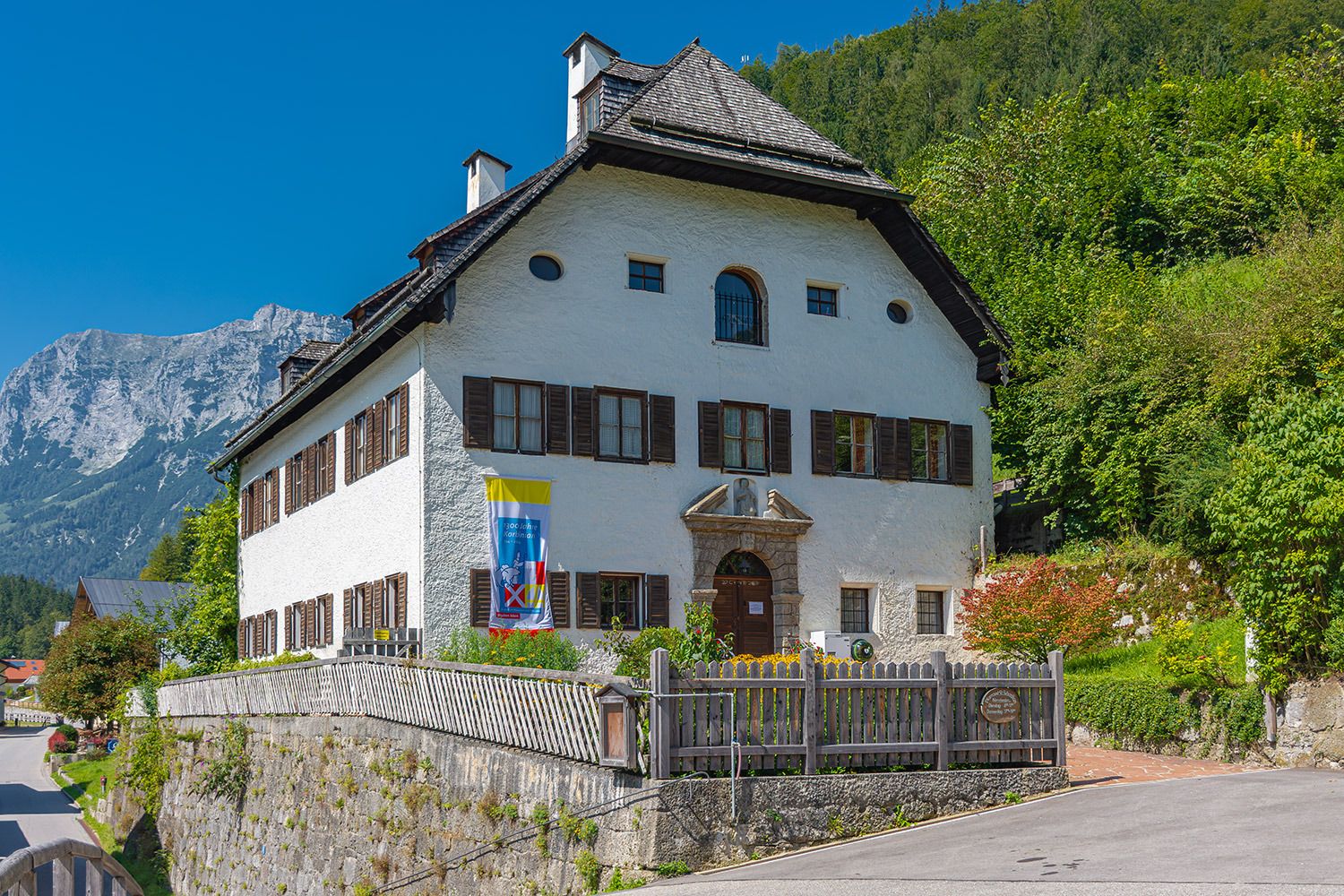 Die Kirche ist ein schönes Beispiel traditioneller alpiner Architektur mit einer schlichten weißen Außenfassade, einem steilen Dach und einem hohen, schlanken Turm mit einem Stern obendrauf.