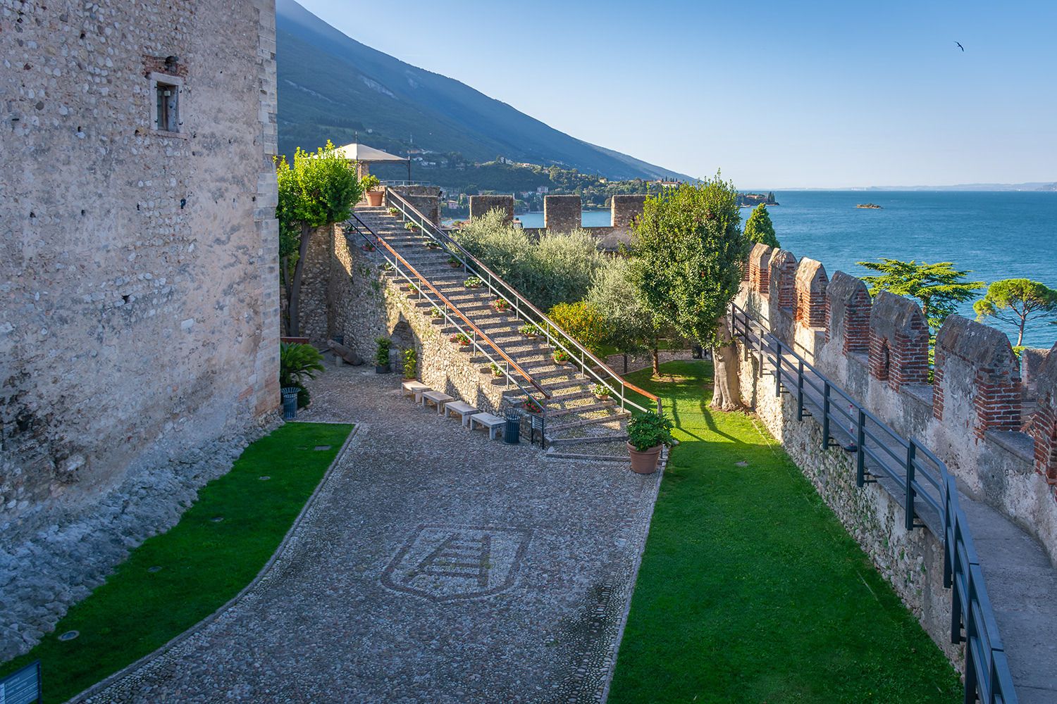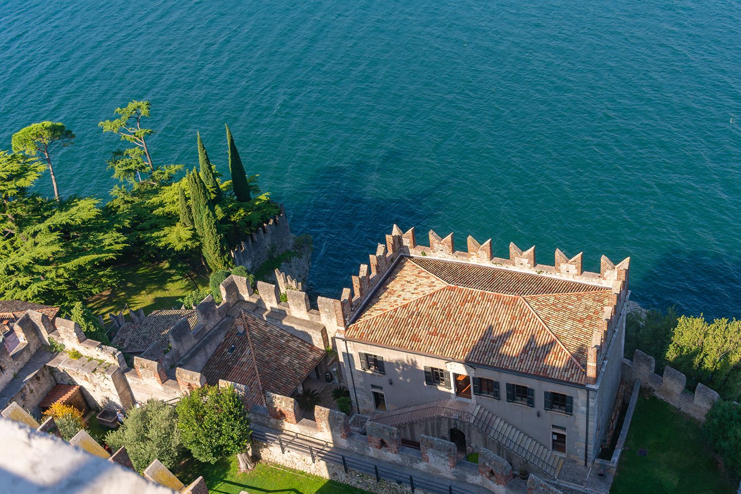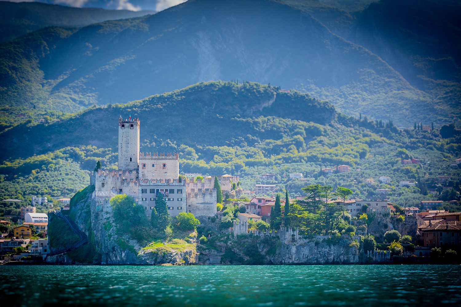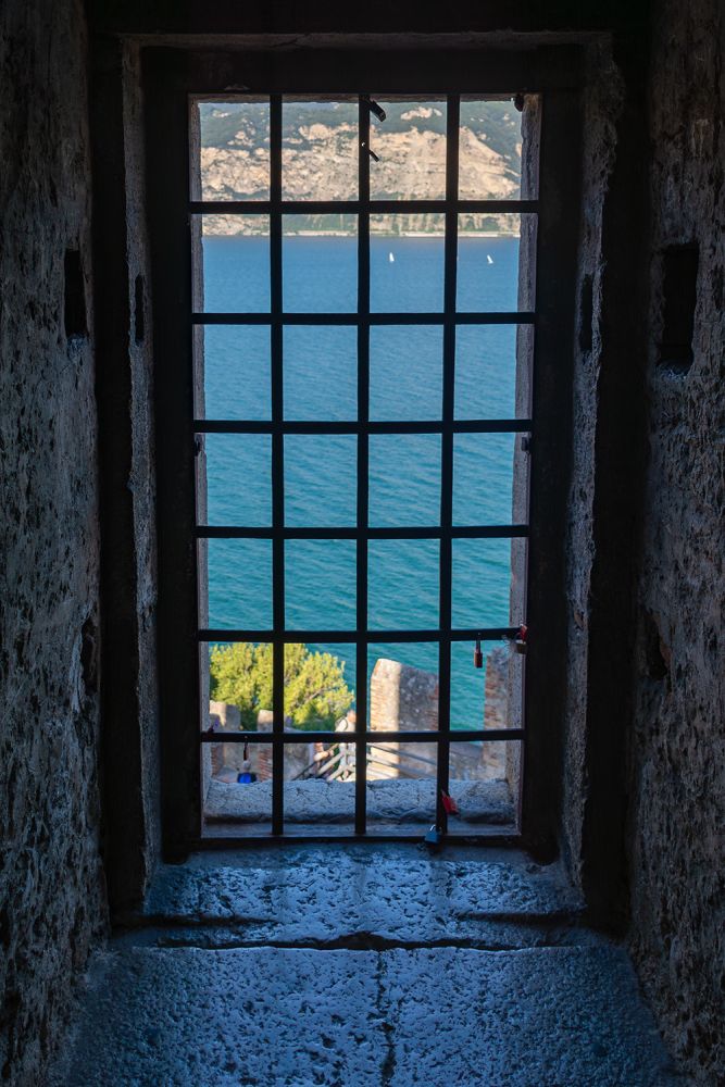Eines der beeindruckendsten Bauwerke am Gardasee ist mit Sicherheit die Scaligerburg (Castello Scaligero) in Malcesine, die auf einem Felsen am Ostufer überhalb der Stadt thront. Der Ursprungsbau der Burg geht wahrscheinlich auf die Langobarder im 1. Jahrtausends nach Christus zurück. Aus dieser Zeit stammen erste Befestigungen der Anlage. Sehr lohnenswert ist der Aufstieg auf den 31 m hohen Turm, von wo man einen tollen Blick über die Stadt Malcesine, den Gardasee und den Monte Baldo (einer Bergkette in den Südlichen Kalkalpen) hat. Aufgenommen wurde dieses Foto von einem der zahlreichen Ausflugsschiffe in Malcesine.