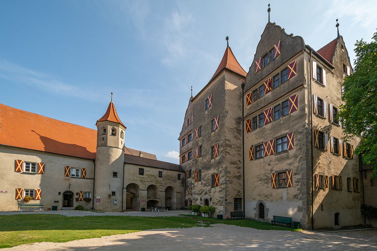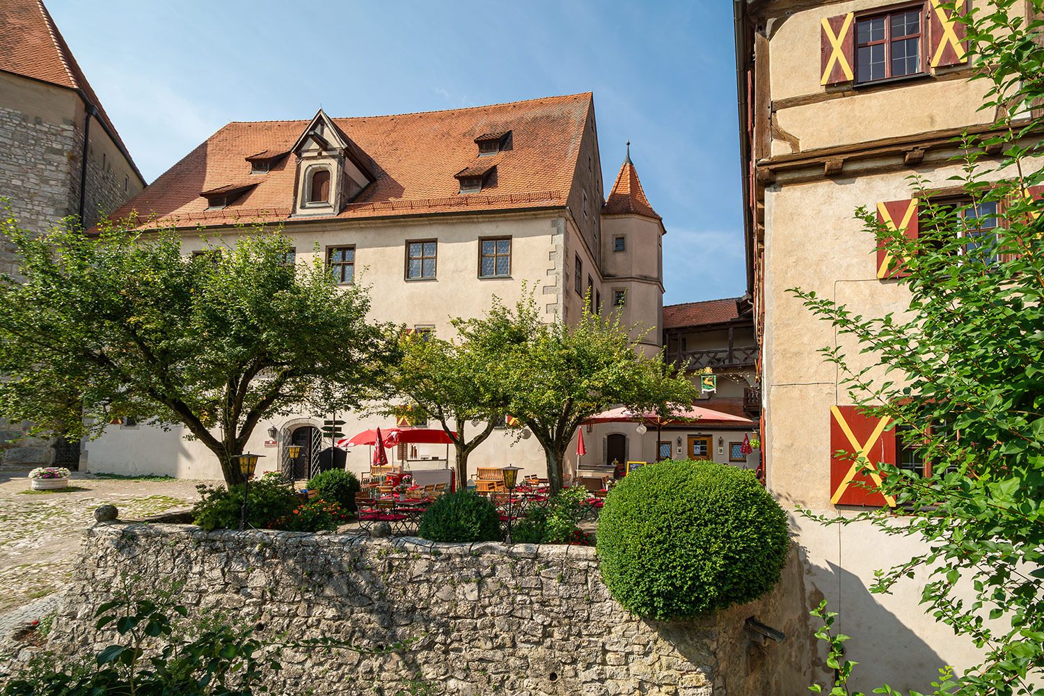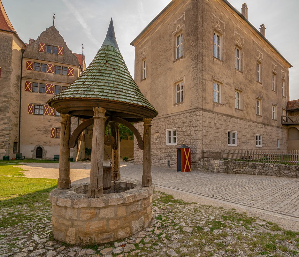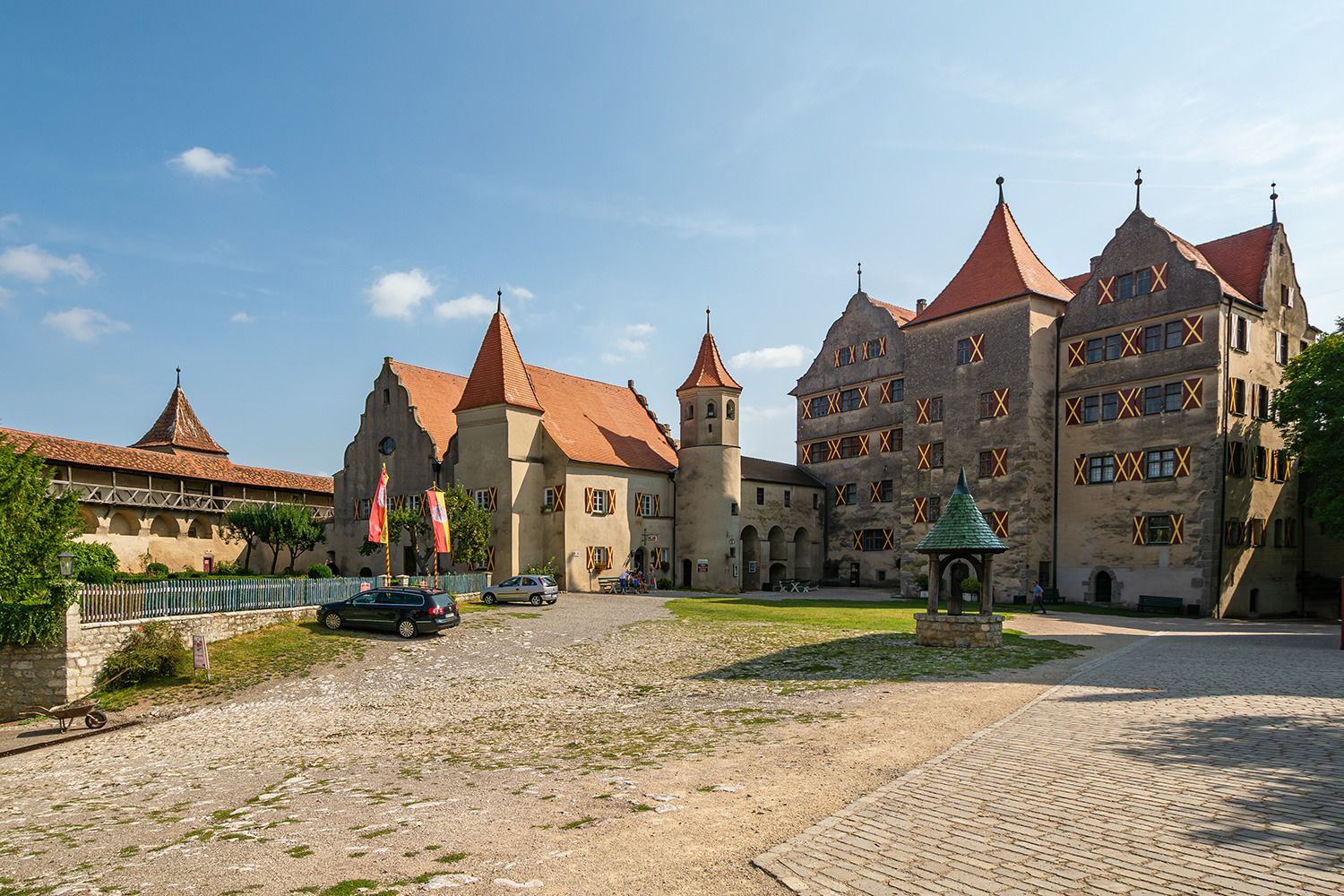 Burg Harburg - Innenhof mit Pfisterbau (links), Fürstenbau (rechts) und Brunnen