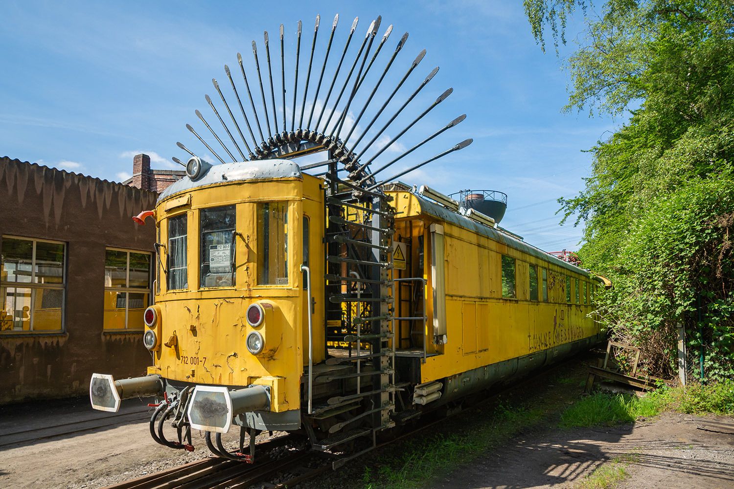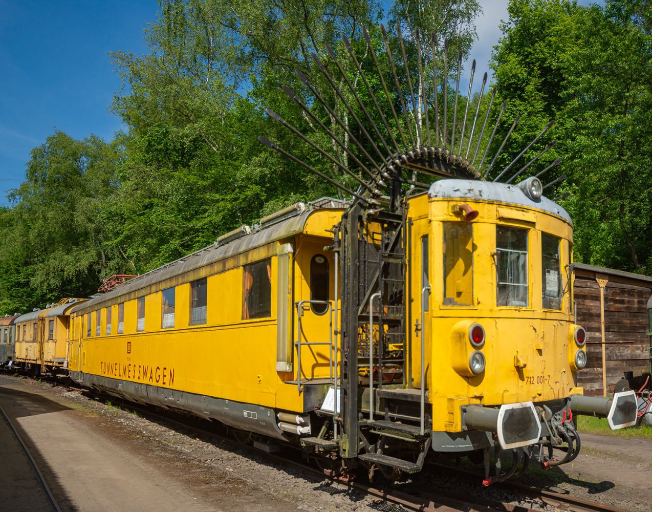 Dieser sehr spezielle Tunnelmesswagen der Deutschen Bundesbahn wurde im Jahr 1935 als Eilzugtriebwagen gebaut und im Jahr 1965 als Messtriebwagen umgebaut. Von diesem Schienenfahrzeug wurde nur ein Exemplar gebaut, welches in ganz Deutschland bis zum Jahr 1994 unter den Namen "Karlsruhe 6210" unterwegs war. Die Umbauarbeiten beinhalteten eine Werkstatt, einige Übernachtungsräume, eine Küche sowie den Messraum selbst. So war sichergestellt, dass die diensthabenden Mannschaften auch mal über einen längeren Zeitraum an Bord bleiben konnten, um ihre Messarbeiten durchzuführen. Der durch einen Dieselgenerator mit 441 KW sowie zwei elektrischen Antriebsmotoren mit jeweils 180 KW angetriebene Tunnelmesswagen, brachte eine Höchstgeschwindigkeit von ca. 100 Km/h auf die Schiene. Die Gesamtlänge über alles betrug 23,05 Meter und das Dienstgewicht, dieses sehr speziellen Schienenfahrzeuges, 58,5 Tonnen. Eine wirklich sehr beeindruckende Messvorrichtung, die die Deutsche Bahn hier entwickelt hat. Diese Aufnahmen entstanden am 25. Mai 2017 im Eisenbahnmuseum Bochum-Dahlhausen.