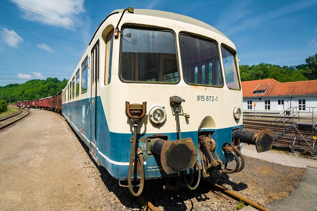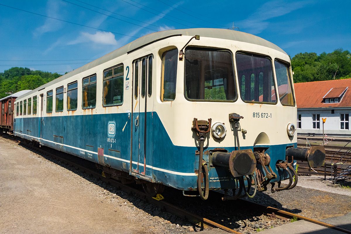 Dieser Akkumulatortriebwagen 815 672-1 wurde im Mai 2017 im Eisenbahnmuseum Bochum-Dahlhausen aufgenommen. Er ist ein elektrisch angetriebener Eisenbahn-Triebwagen, der die benötigte Energie aus Akkumulatoren bezieht, um die Antriebsachsen mit Elektomotoren in Bewegung versetzen zu können. Gebaut wurde dieser Akkutriebwagen von dem deutschen Maschinenbauunternehmen Orenstein & Koppel AG, welches sich am 1. April 1876 gegründet hat und im Jahr 1999 von Fiat mehrheitlich übernommen wurde.